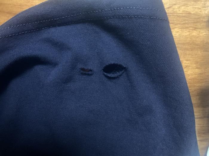 8月28日本人在大润发一楼买了件衣服,当时就试了一下,没仔细检查,看合身就微信付了一下款拿了衣服走了。今天早上起来拿衣服穿发现后面下边有二个好大的洞。晚上吃了晚饭就去大润发想去换衣服。