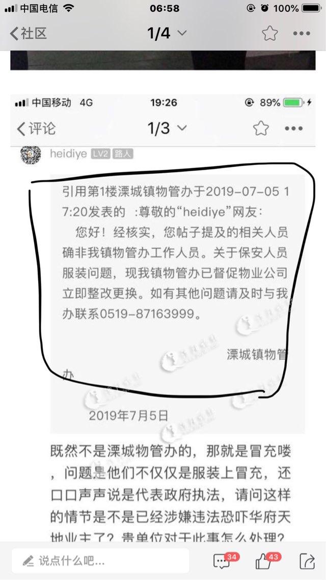 引用 引用楼主heidiye于2019-07-05 19:26发表的 :既然不是溧城物管办的,那就是冒充喽,问题是他们不仅仅是服装上冒充,还口口声声说是代表政府执法,请问这样的情节是不是已经涉嫌违法恐吓华府天地业主了?贵单位对于此事怎么处理? (2019-07-05 19:26) X;v{,P=J